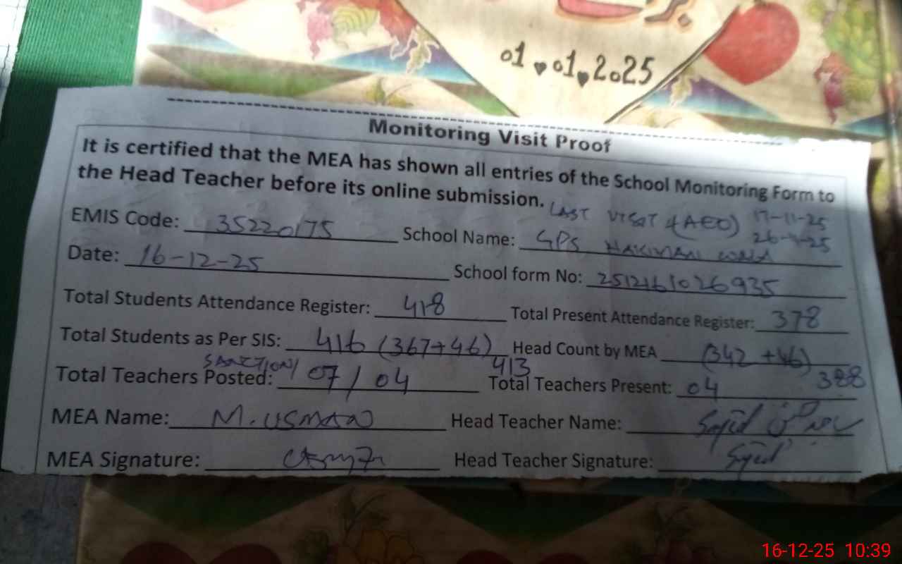 | Remarks (Use Separate Page if Required): Teacher named Khizar Hayat PST is suspended since 13 August 2025 Furniture is required for 03 teachers and 100 students 01 wash room is nonfunctional due to blocked | |||||