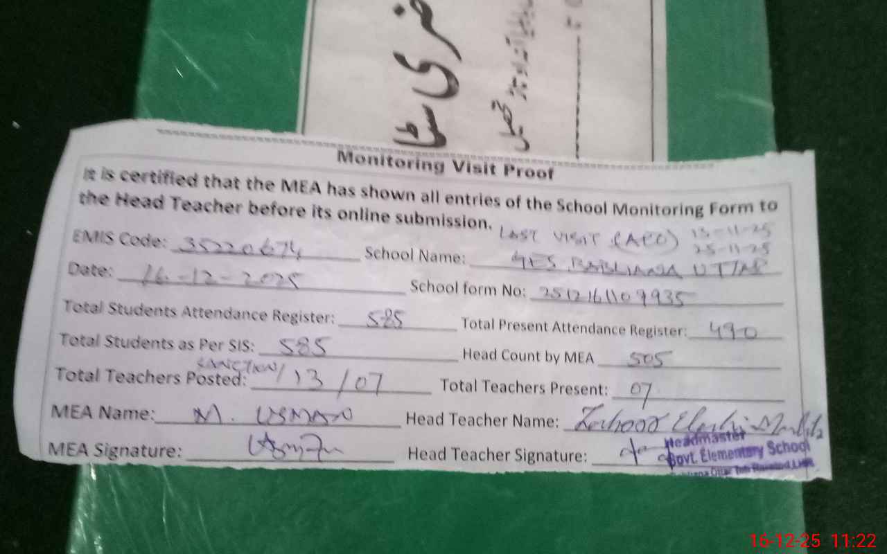 | Certified that this School was Inspected by the Undersigned MEA/DMO Today and the Information Stated Above is as Per Record. | |||||