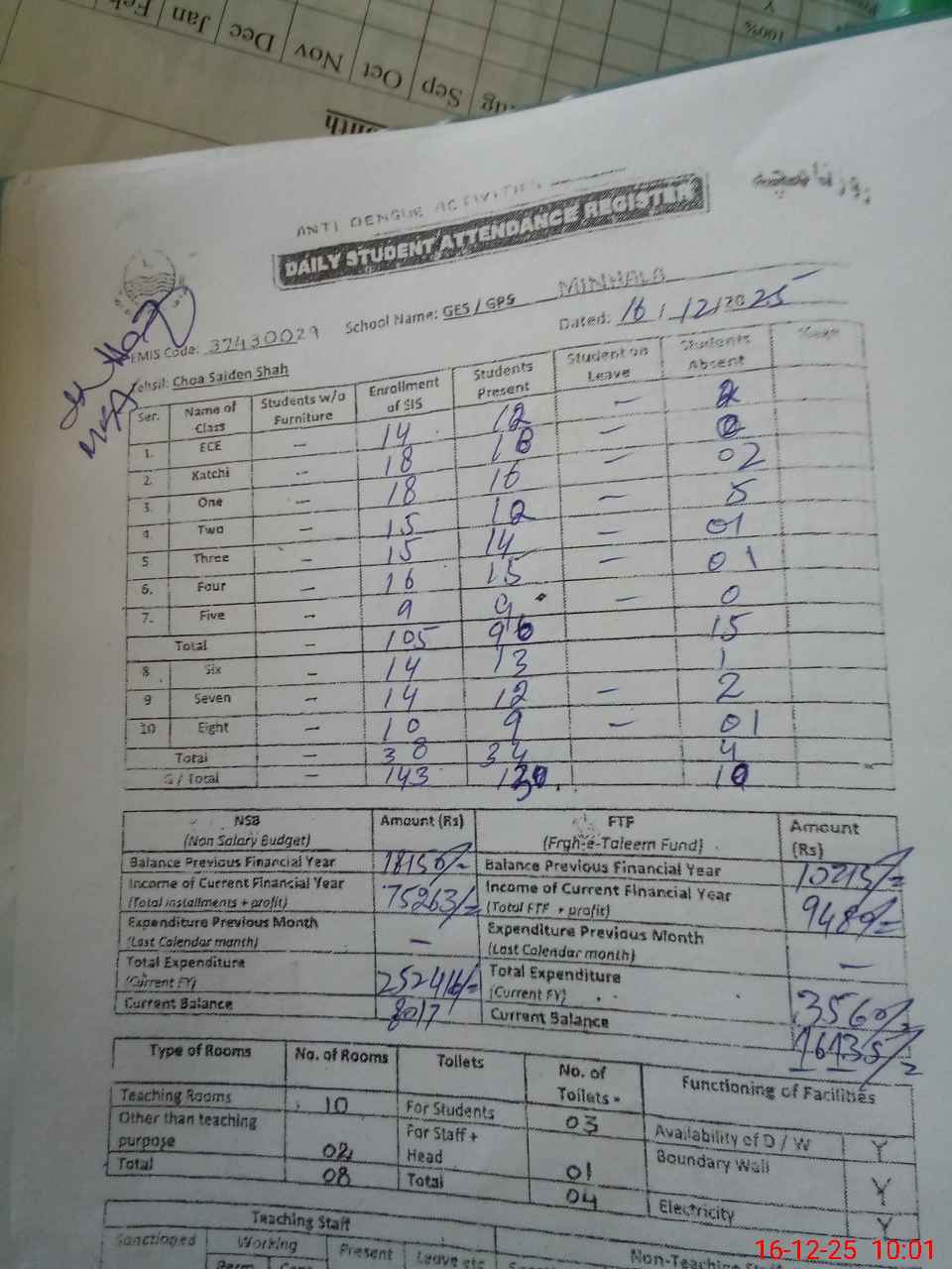| Total no. of Classrooms: 10 No. of Classrooms Used for Teaching: 9 No. of Classrooms Storing Old Furniture, FTBs, etc: 0Comments if Any: 0 |