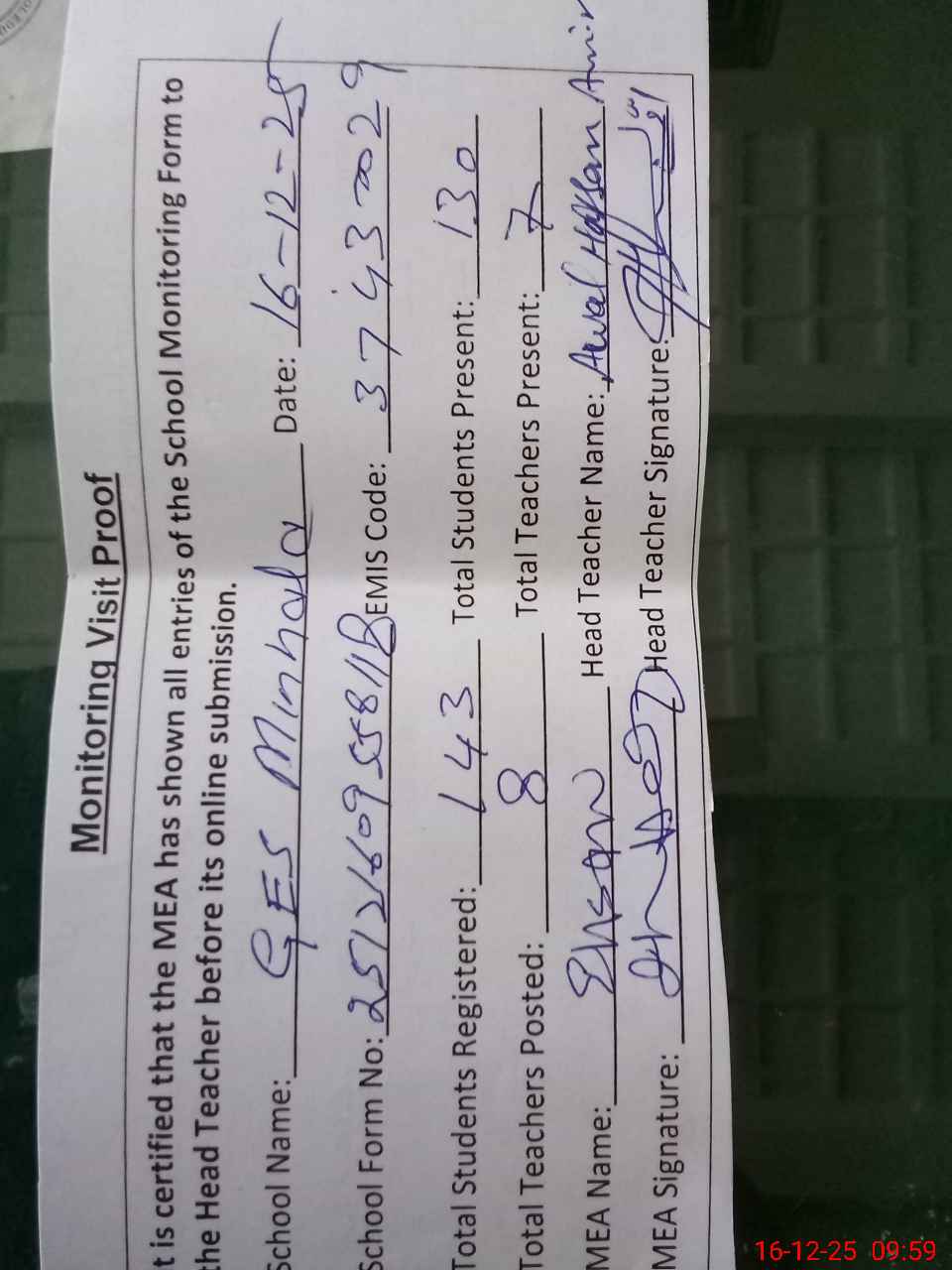 | Attendance Register | Head Teacher | MEA with School | Visit Proof |