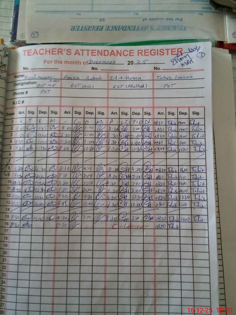 | CNIC | Full Name | Designation | R/C | Absence during last cal. month |