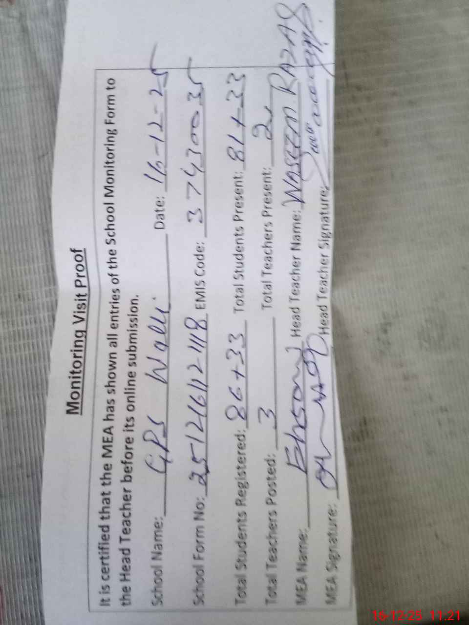 | Attendance Register | Head Teacher | MEA with School | Visit Proof |