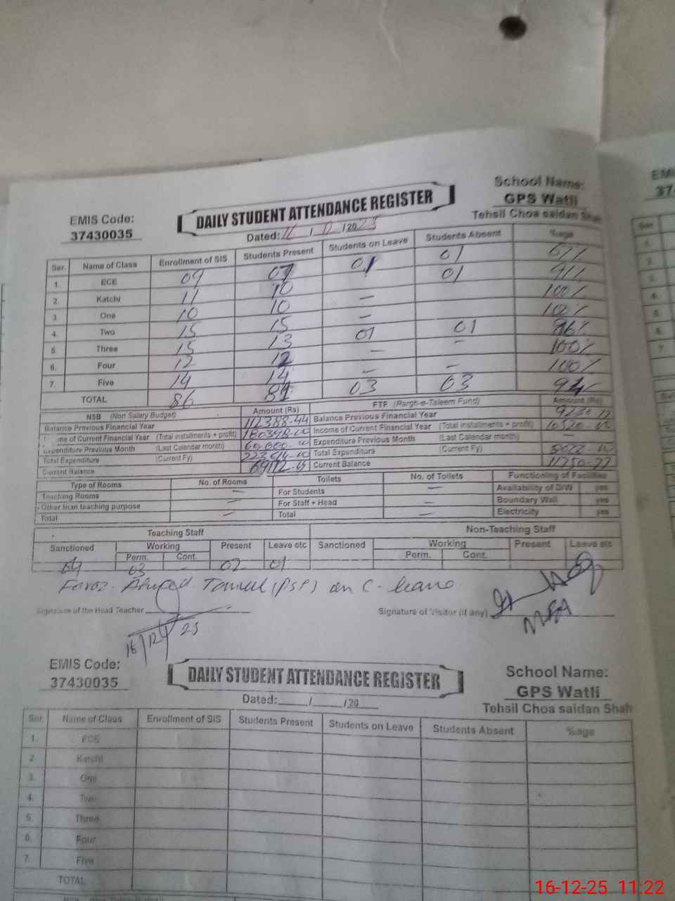 | Remarks (Use Separate Page if Required): Sir upto 5 class Str is 86. and 33 students in afternoon class | |||||