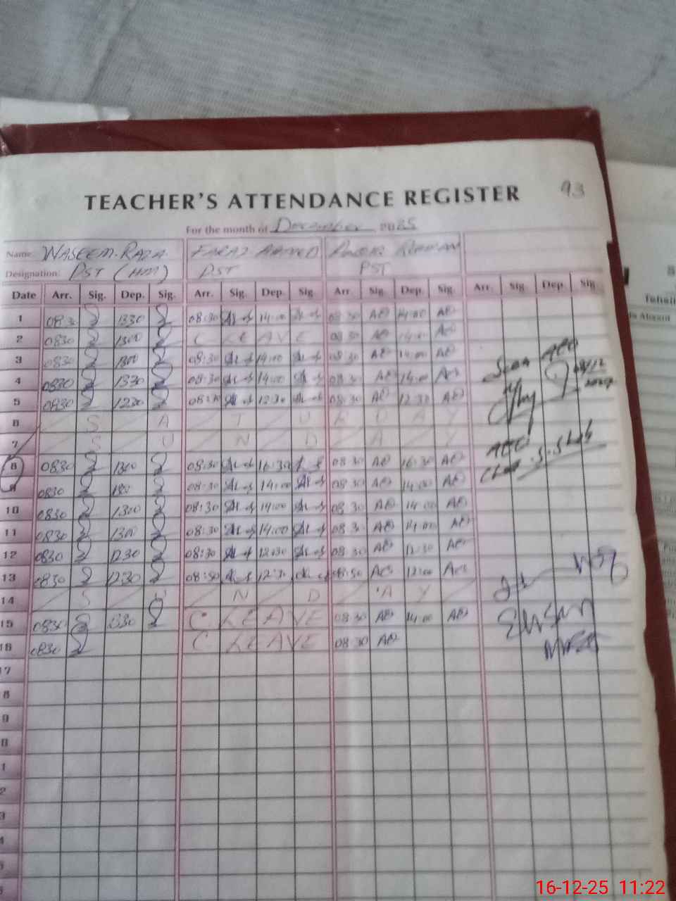 | CNIC | Full Name | Designation | R/C | Absence During Last Calender Month |