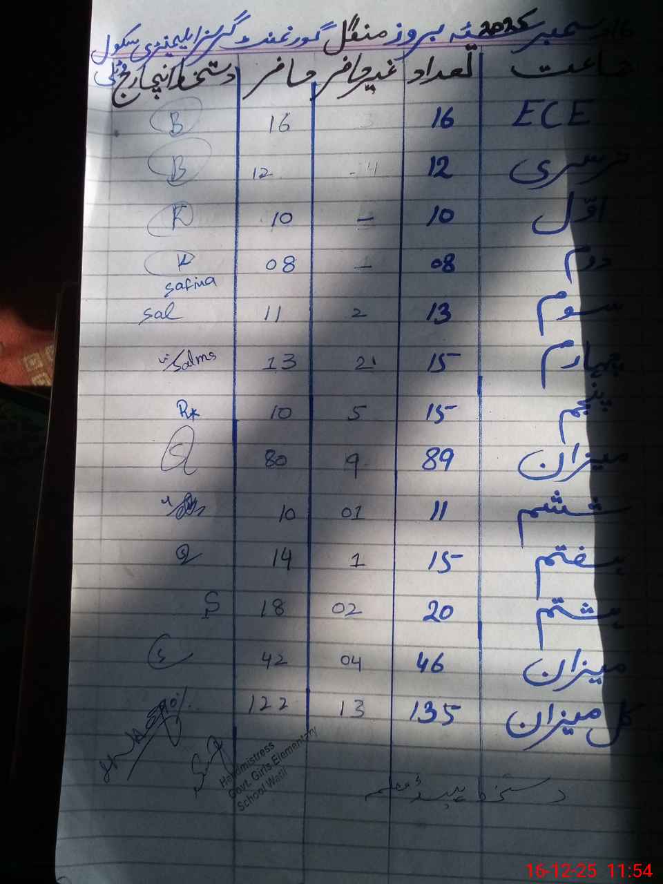 | Total Students Present | 0 | 16 | 10 | 8 | 11 | 13 | 10 | 10 | 14 | 18 | 122 | |||||