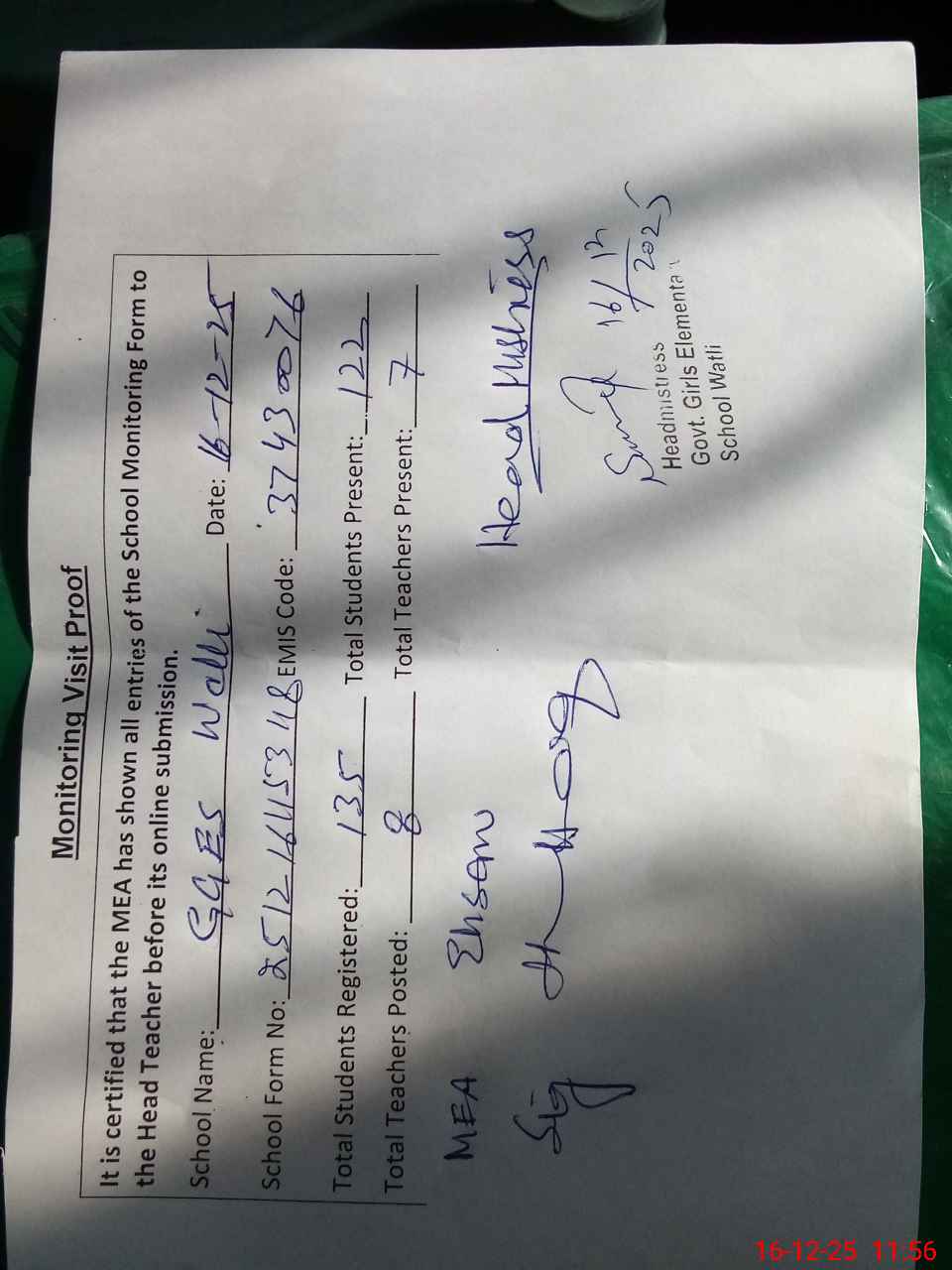 | Attendance Register | Head Teacher | MEA with School | Visit Proof |