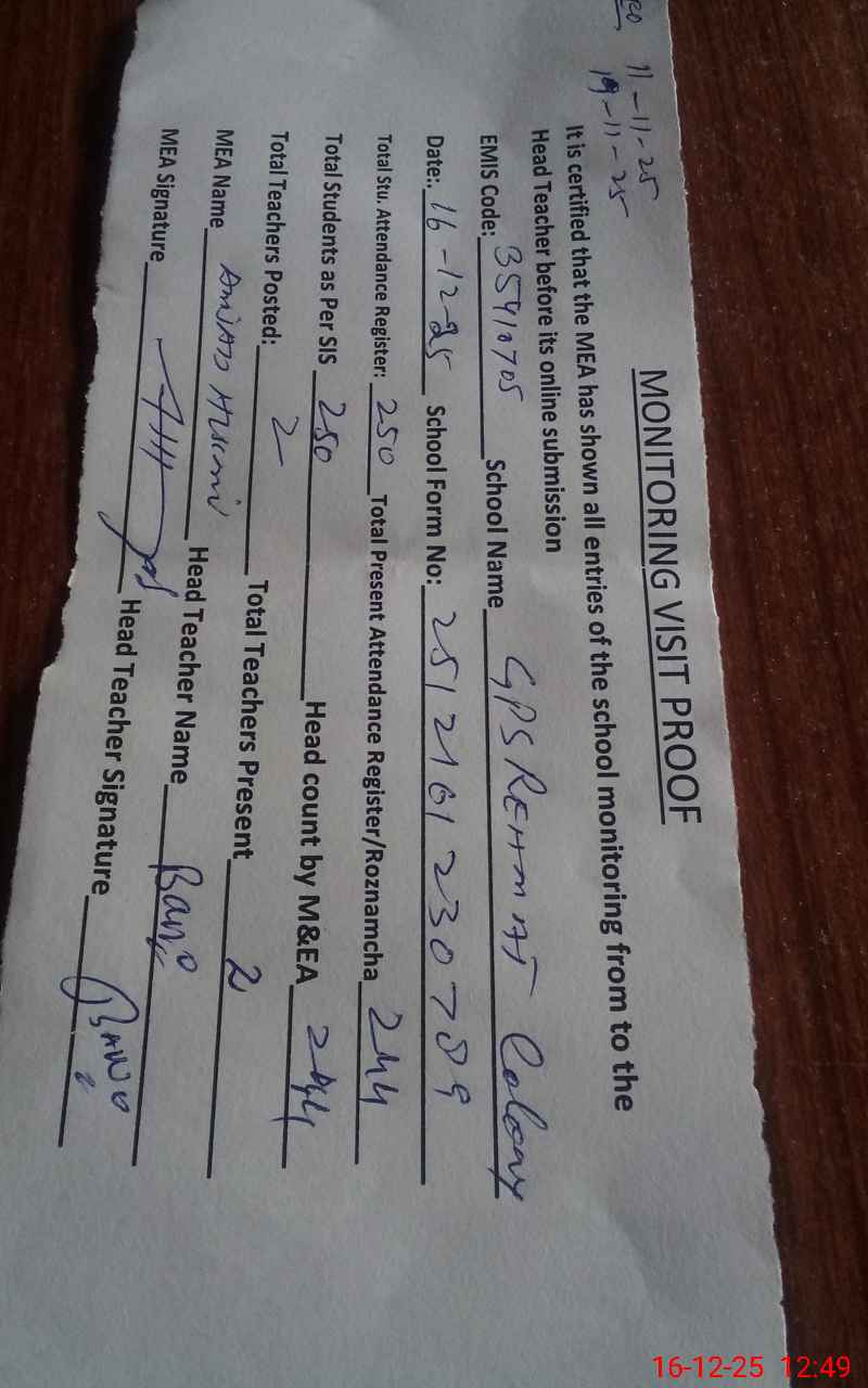 | EMIS Code: 35410705 | Name of School: GPS REHMAT COLONY FEROZWALA | |||