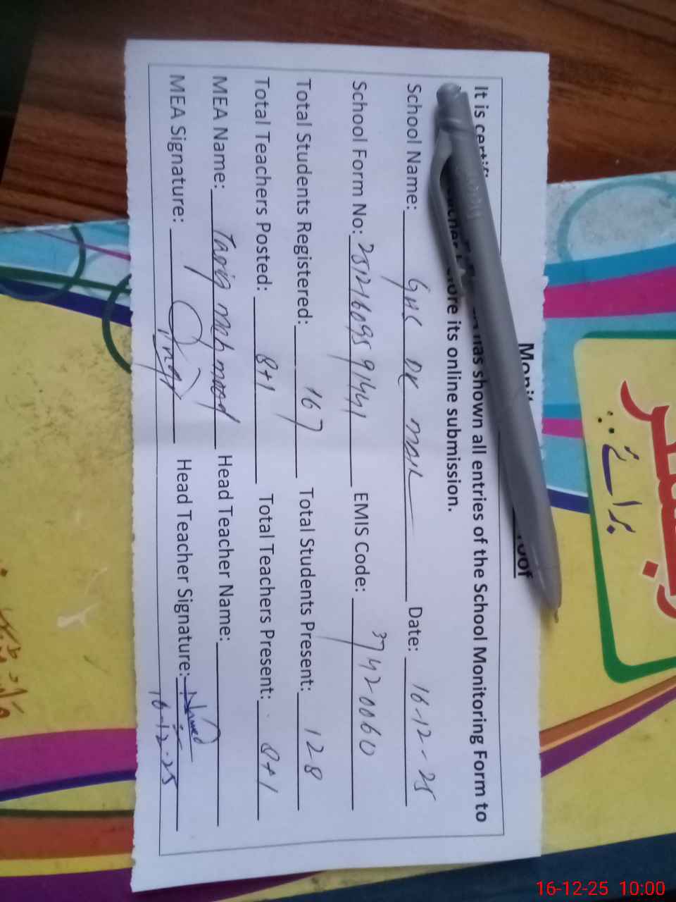 | Attendance Register | Head Teacher | MEA with School | Visit Proof |