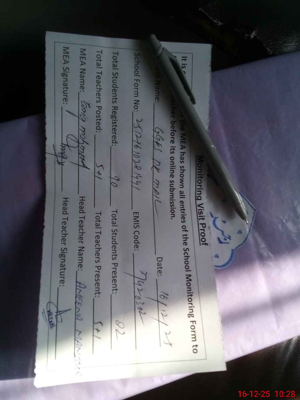 | Attendance Register | Head Teacher | MEA with School | Visit Proof |