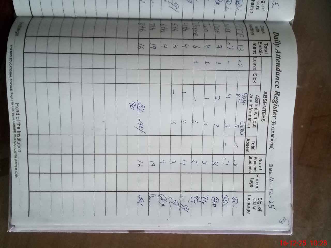 | Total Students Present | 0 | 8 | 8 | 3 | 5 | 4 | 3 | 9 | 19 | 16 | 82 | |||||