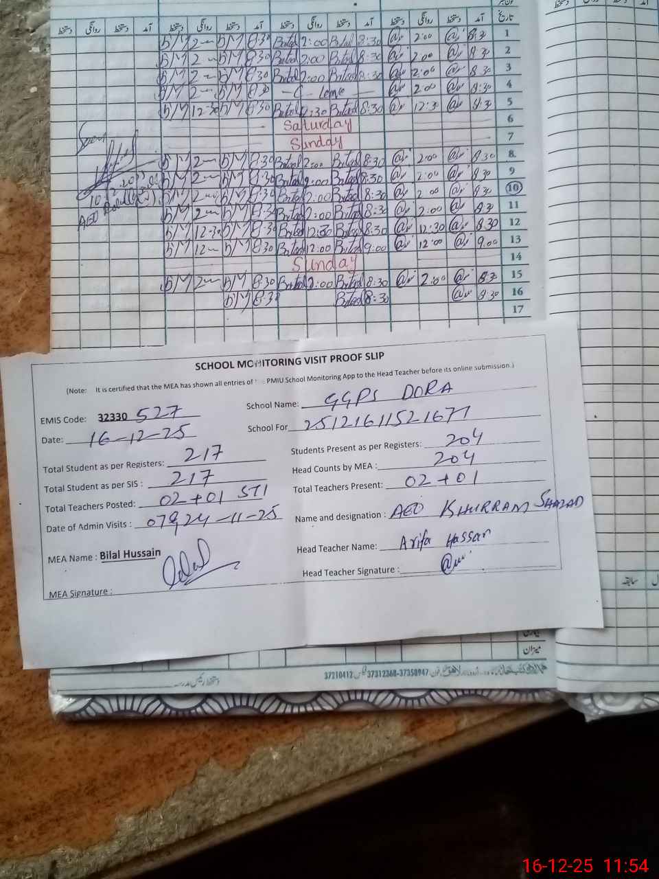 | Attendance Register | Head Teacher | MEA with School | Visit Proof |