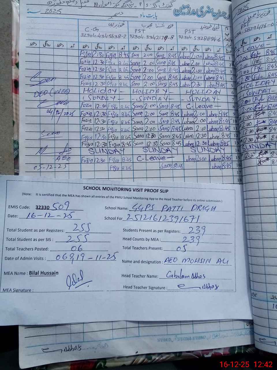 | Attendance Register | Head Teacher | MEA with School | Visit Proof |