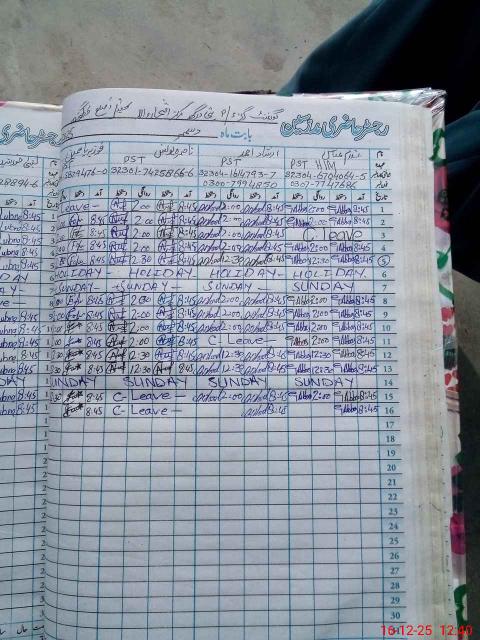 | CNIC | Full Name | Designation | R/C | Absence during last cal. month |