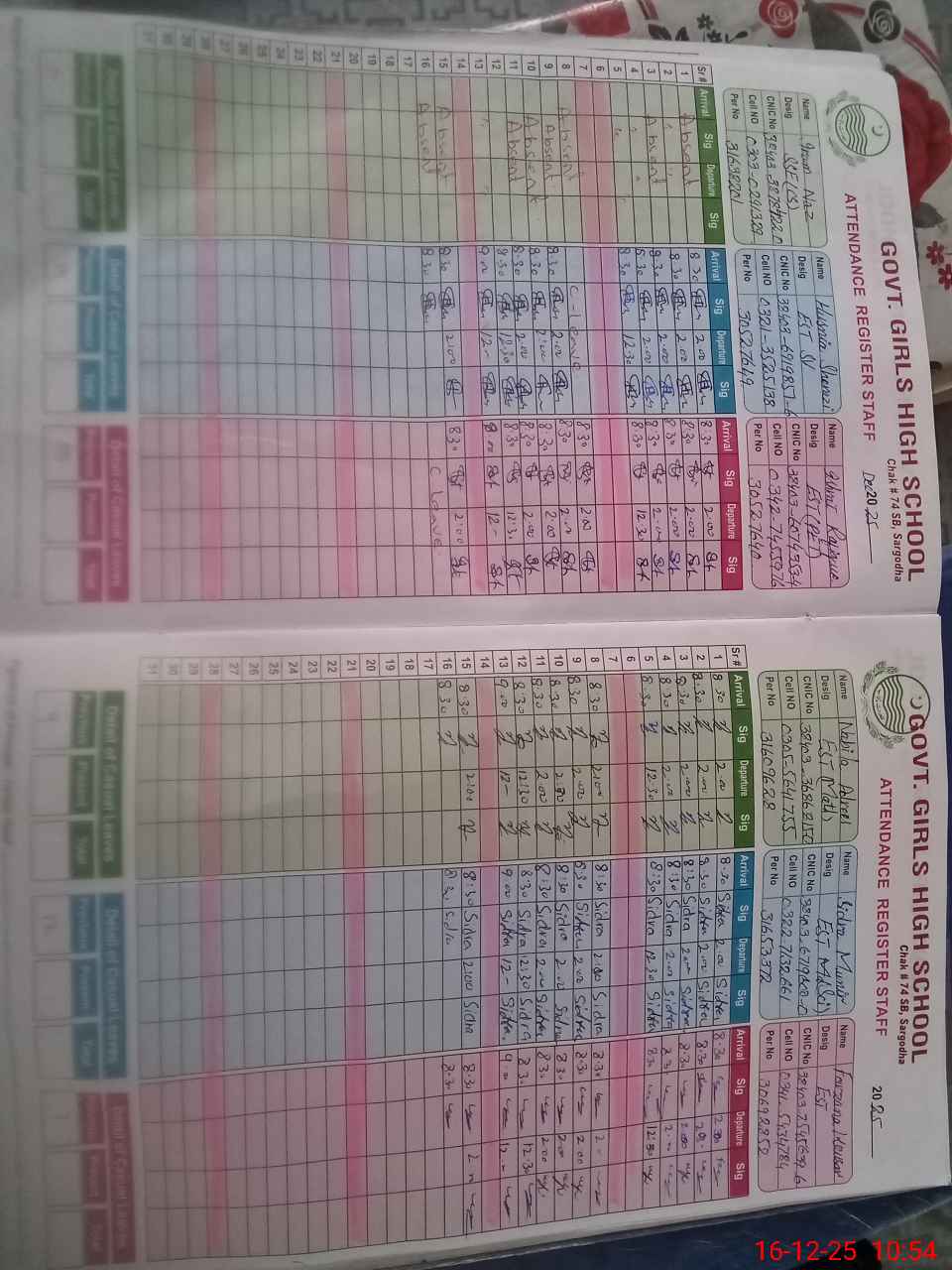 | CNIC | Full Name | Designation | R/C | Absence during last cal. month |