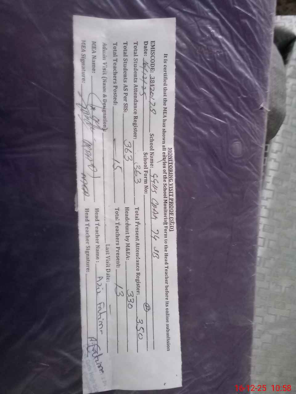 | Attendance Register | Head Teacher | MEA with School | Visit Proof |