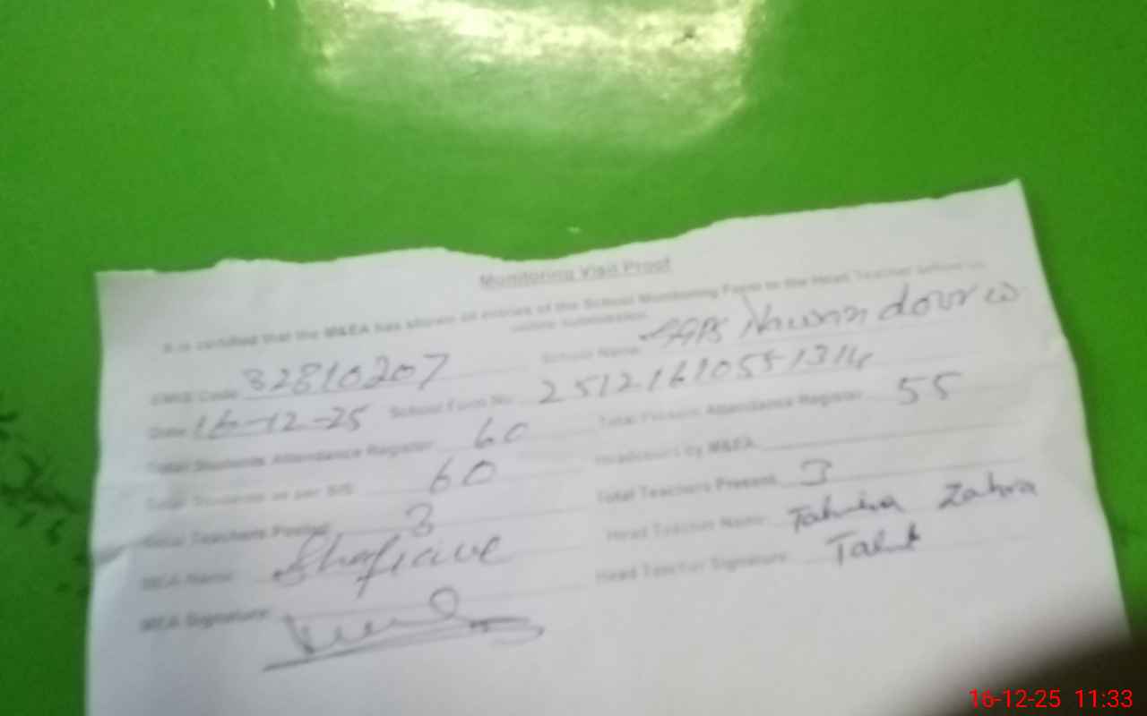 | Attendance Register | Head Teacher | MEA with School | Visit Proof |