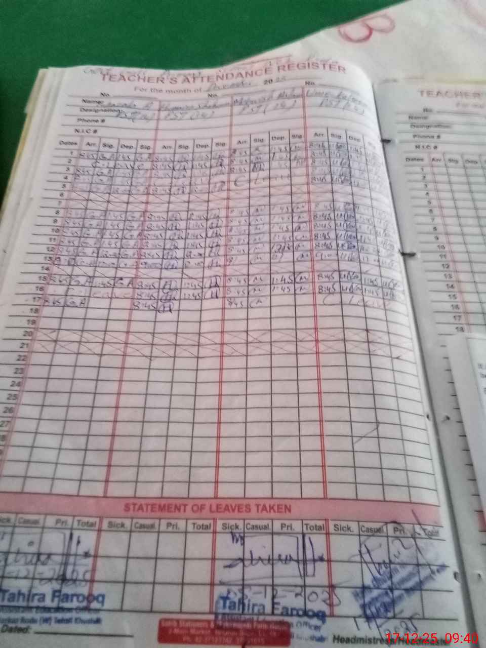 | CNIC | Full Name | Designation | R/C | Absence During Last Calender Month |