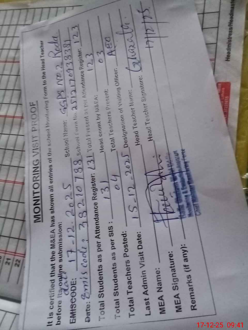 | Attendance Register | Head Teacher | MEA with School | Visit Proof |