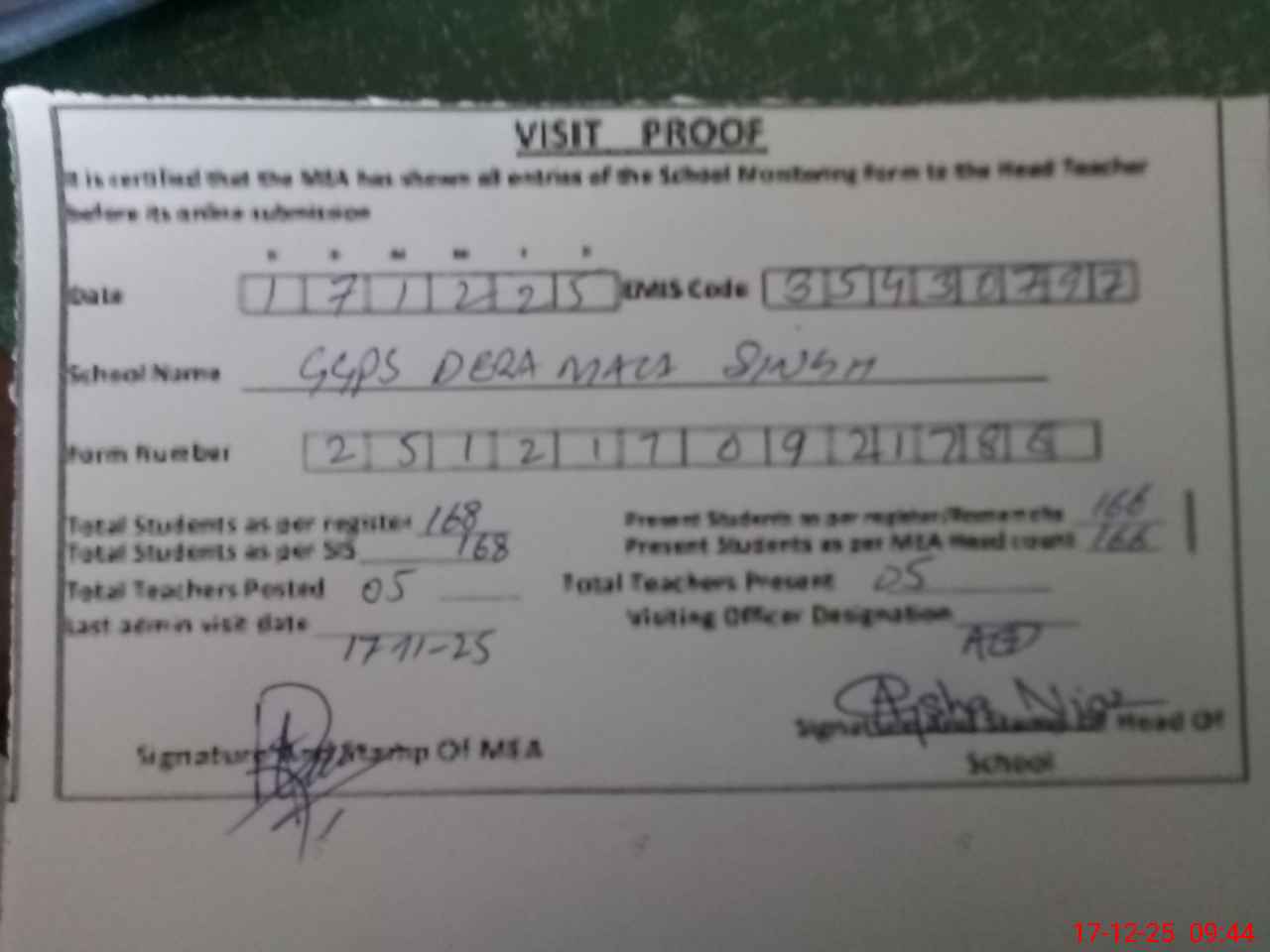 | Attendance Register | Head Teacher | MEA with School | Visit Proof |