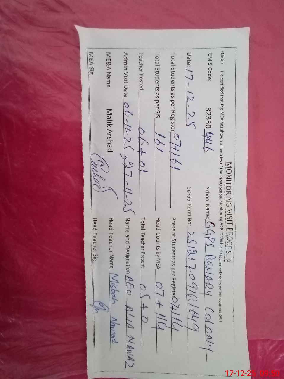| EMIS Code: 32330446 | Name of School: GGPS BEHARY COLONY | |||