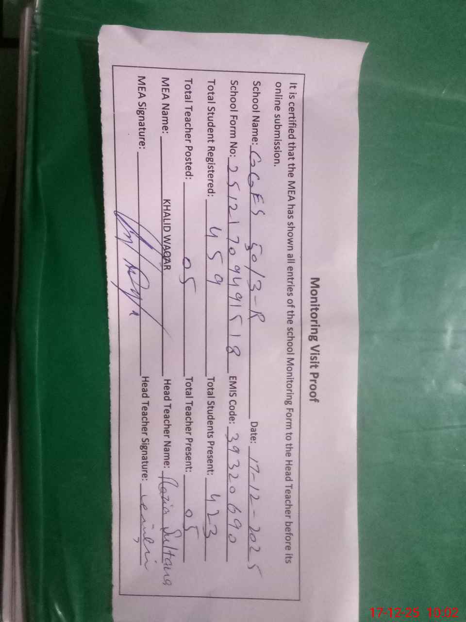 | Attendance Register | Head Teacher | MEA with School | Visit Proof |