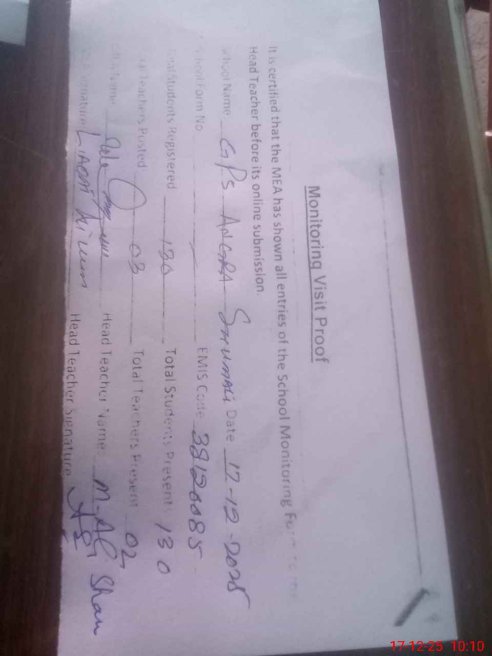 | Attendance Register | Head Teacher | MEA with School | Visit Proof |