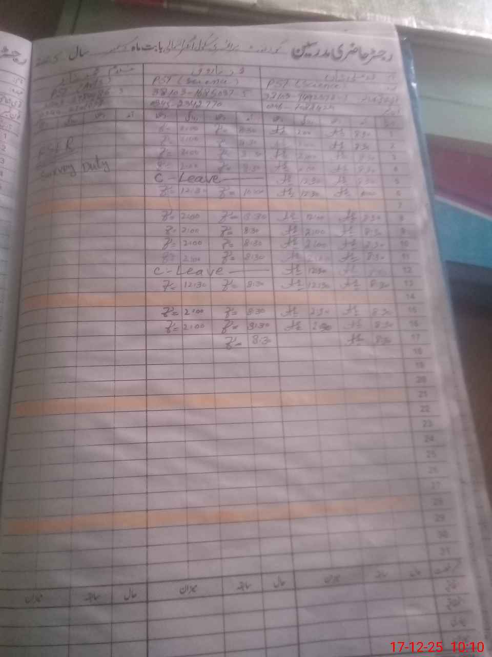 | CNIC | Full Name | Designation | R/C | Absence During Last Calender Month |