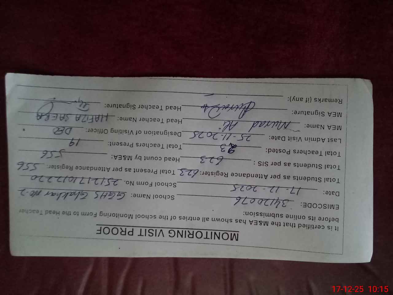 | Attendance Register | Head Teacher | MEA with School | Visit Proof |