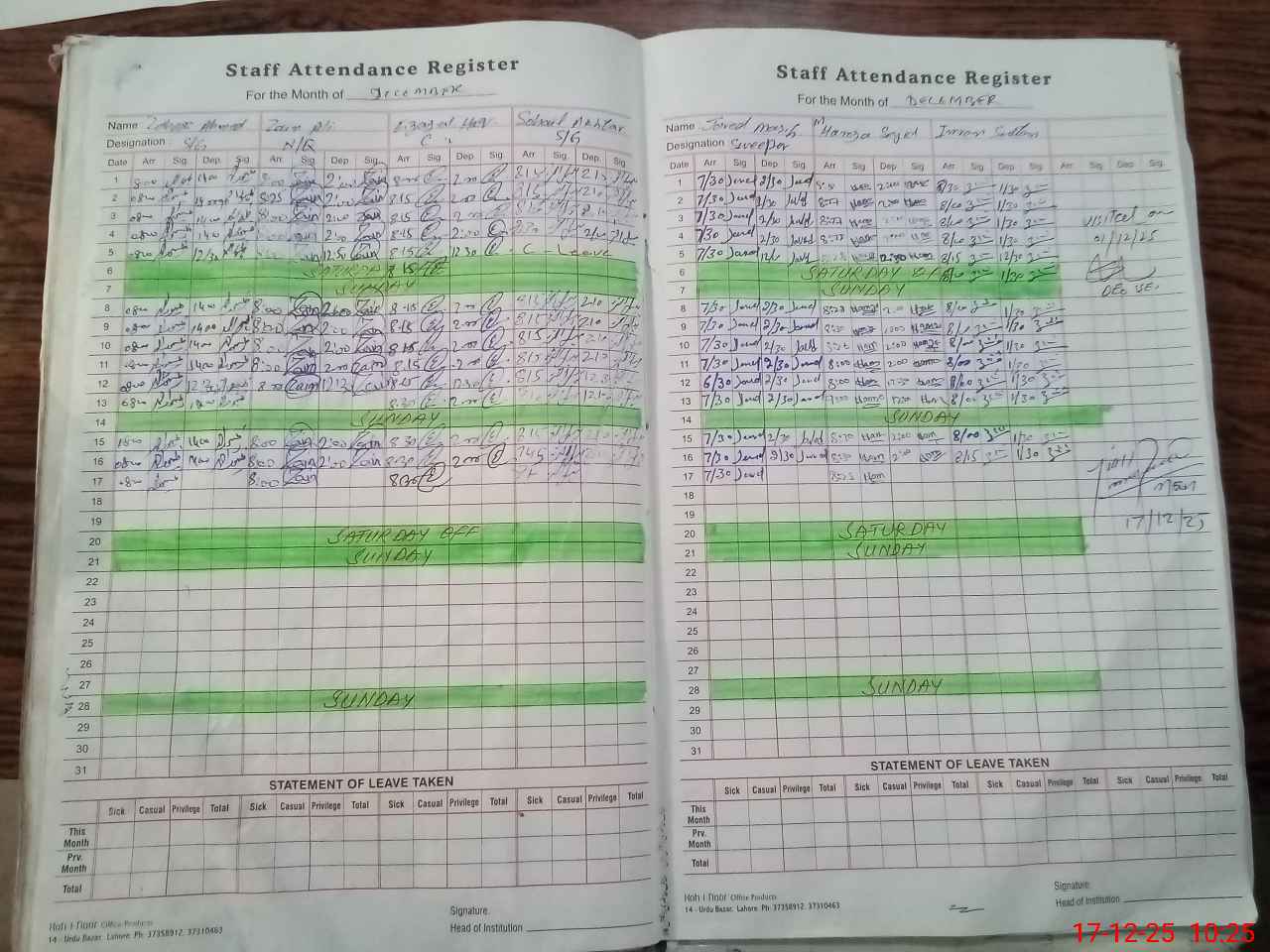 | CNIC | Full Name | Designation | R/C | Absence During Last Calender Month |