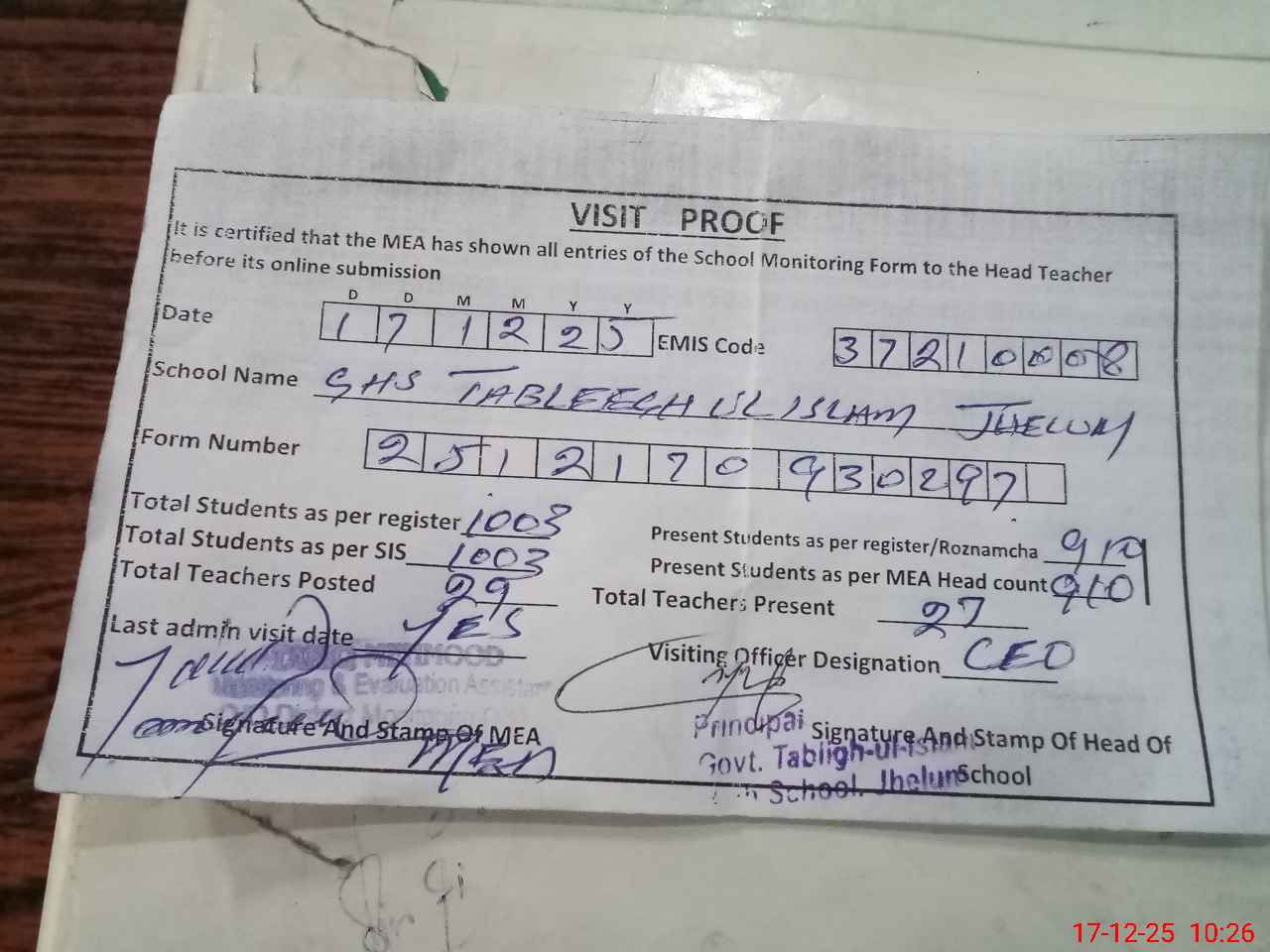 | Attendance Register | Head Teacher | MEA with School | Visit Proof |