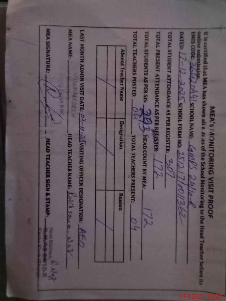 | Attendance Register | Head Teacher | MEA with School | Visit Proof |