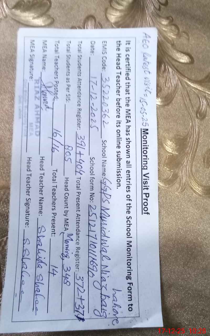| Certified that this School was Inspected by the Undersigned MEA/DMO Today and the Information Stated Above is as Per Record. | |||||