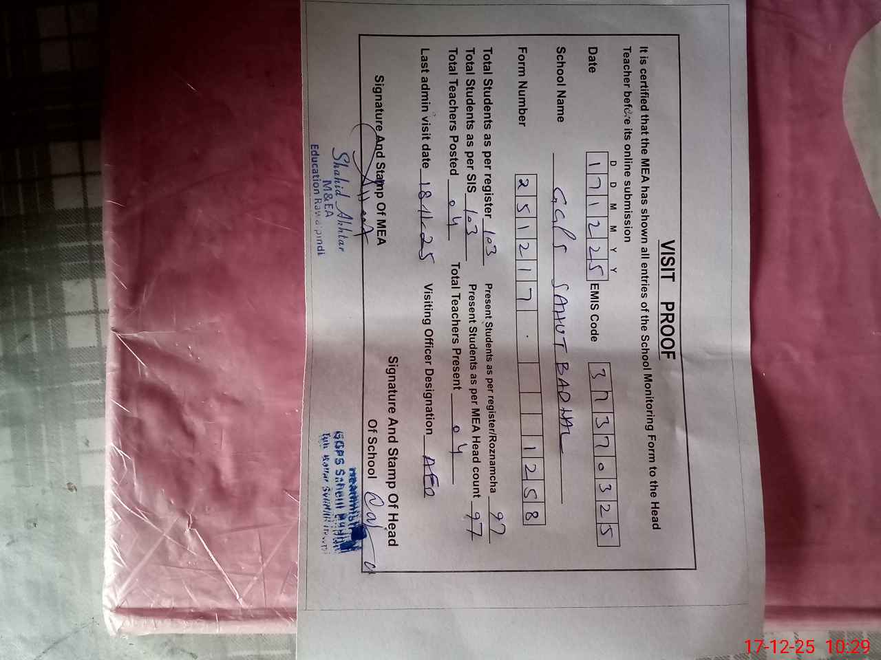 | Attendance Register | Head Teacher | MEA with School | Visit Proof |