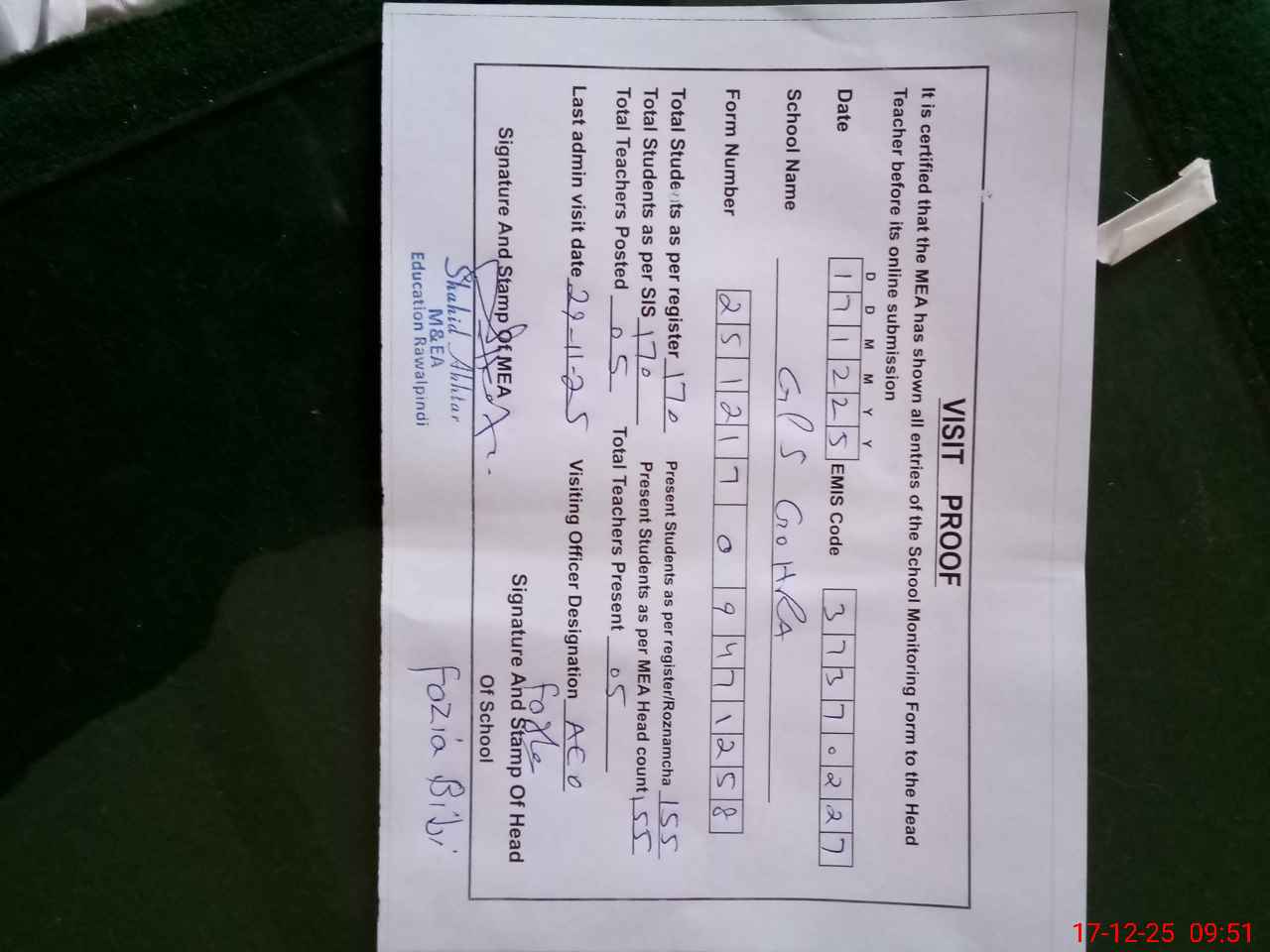 | Attendance Register | Head Teacher | MEA with School | Visit Proof |