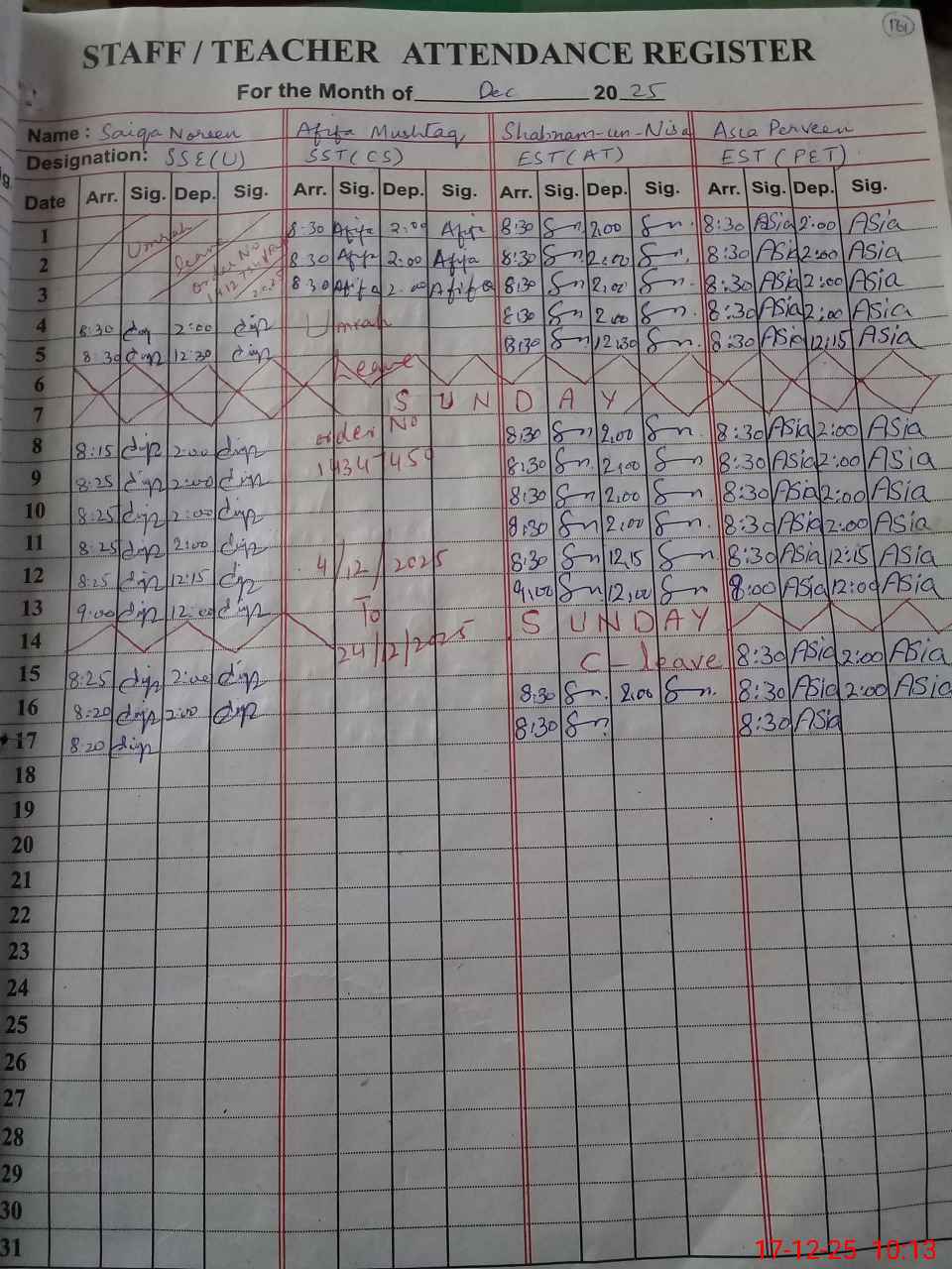 | CNIC | Full Name | Designation | R/C | Absence During Last Calender Month |