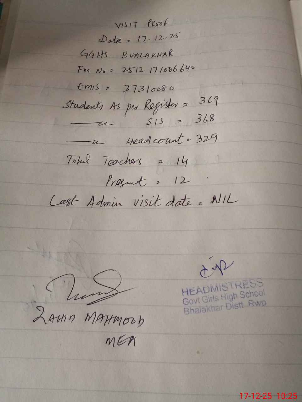 | Attendance Register | Head Teacher | MEA with School | Visit Proof |