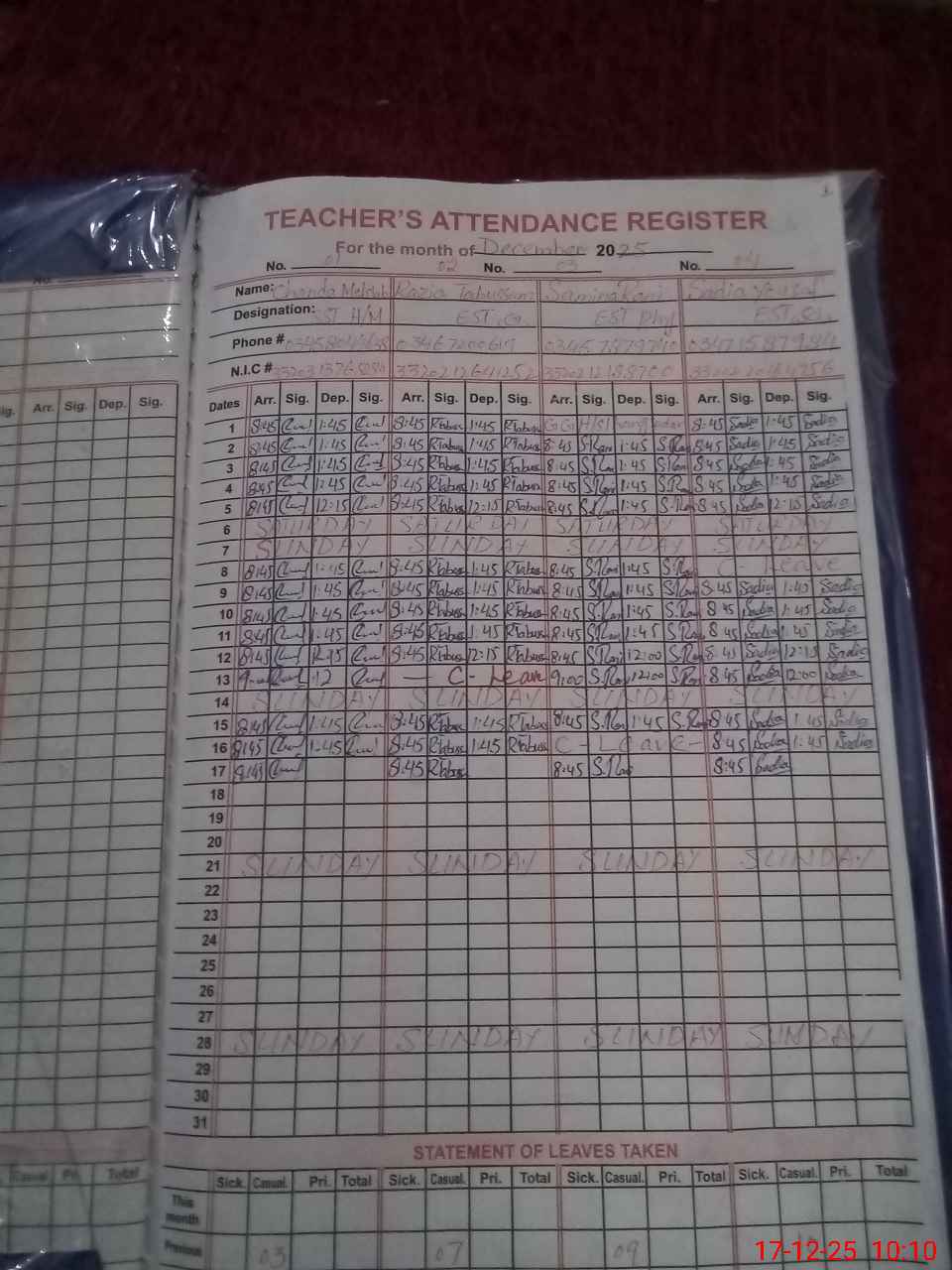 | CNIC | Full Name | Designation | R/C | Absence During Last Calender Month |