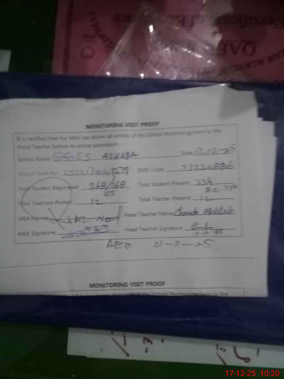 | Attendance Register | Head Teacher | MEA with School | Visit Proof |