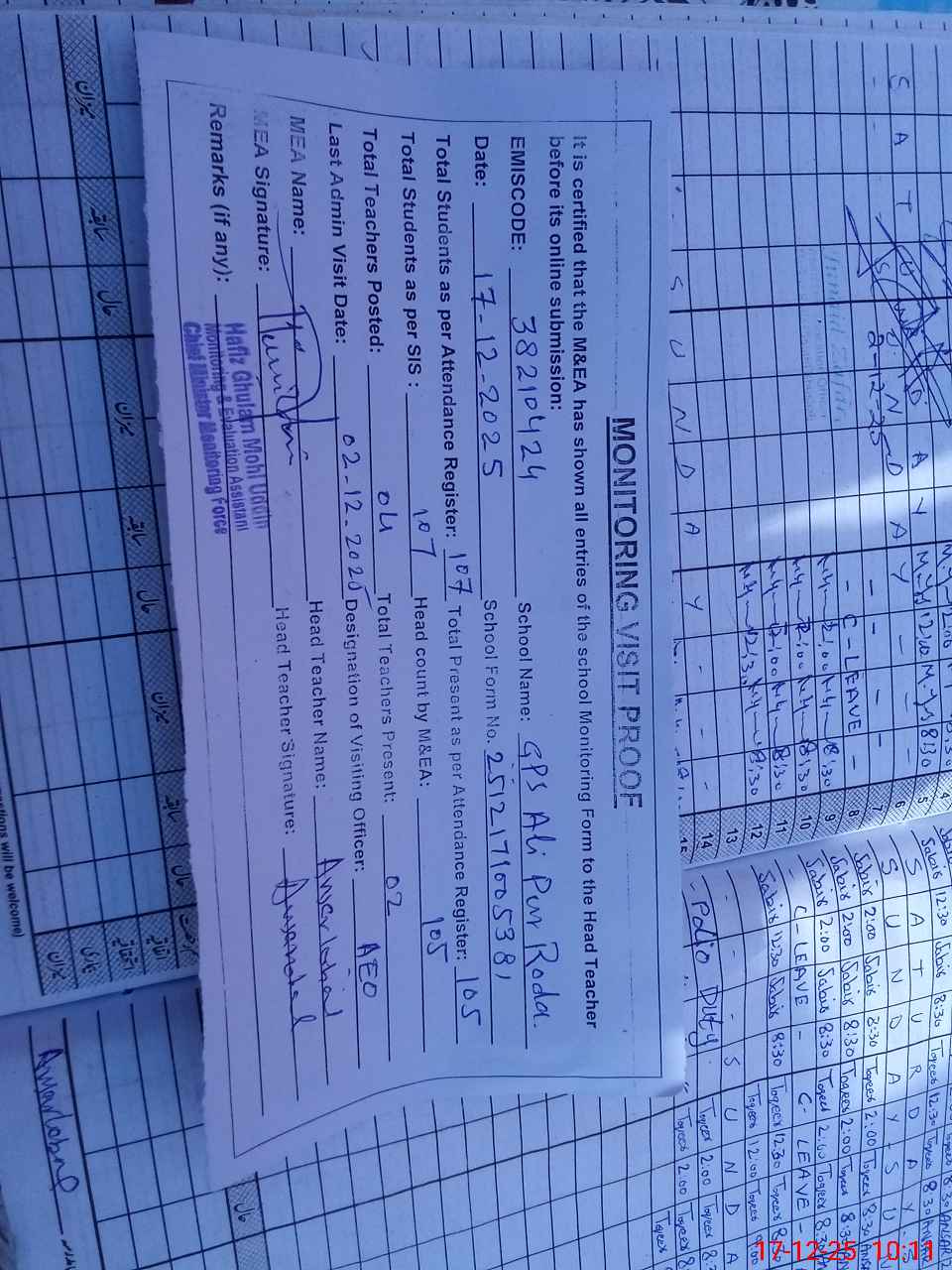 | Attendance Register | Head Teacher | MEA with School | Visit Proof |