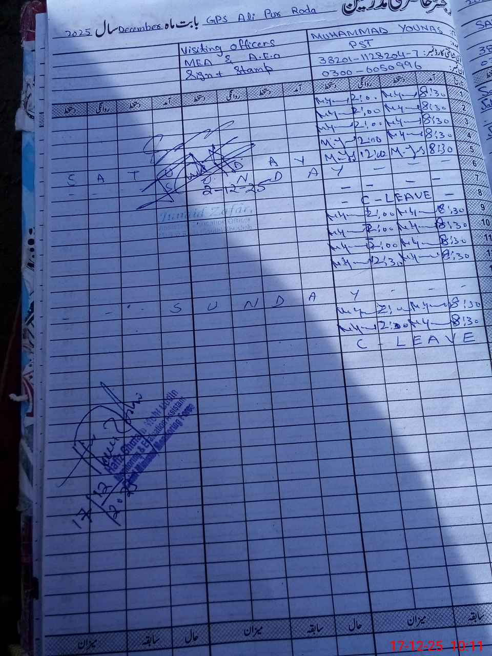 | CNIC | Full Name | Designation | R/C | Absence during last cal. month |