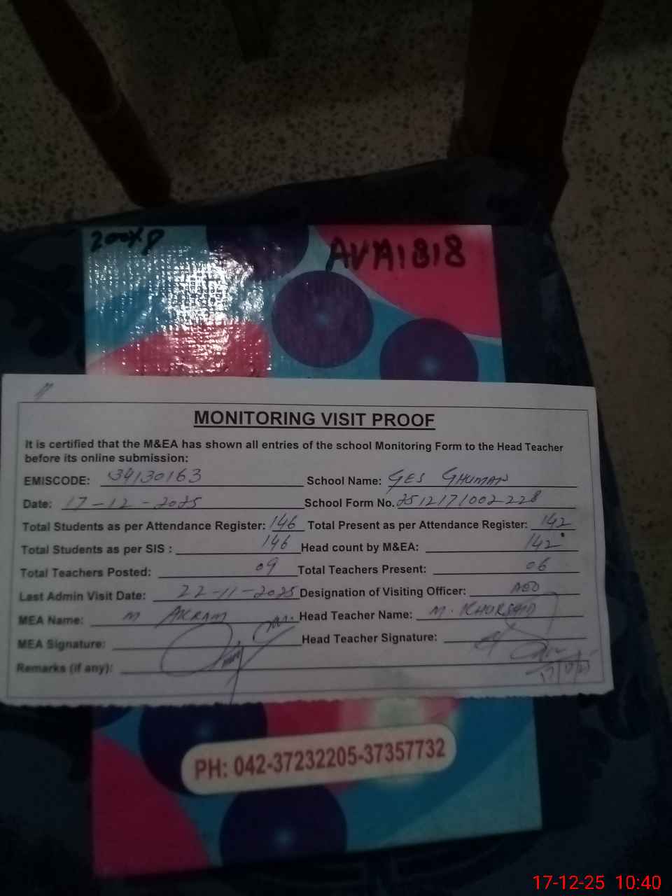 | Attendance Register | Head Teacher | MEA with School | Visit Proof |