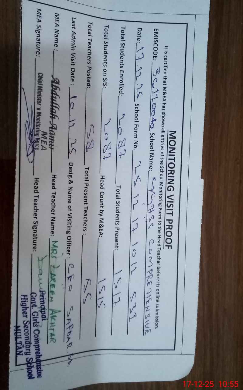 | EMIS Code: 36110040 | Name of School: GGHSS COMPREHENSIVE GULGASHT COLONY MULTAN | |||