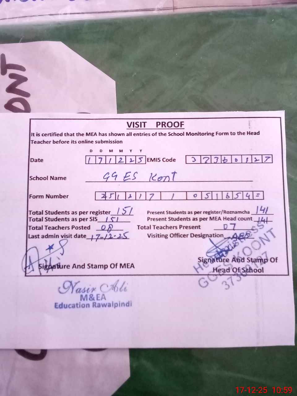 | Attendance Register | Head Teacher | MEA with School | Visit Proof |