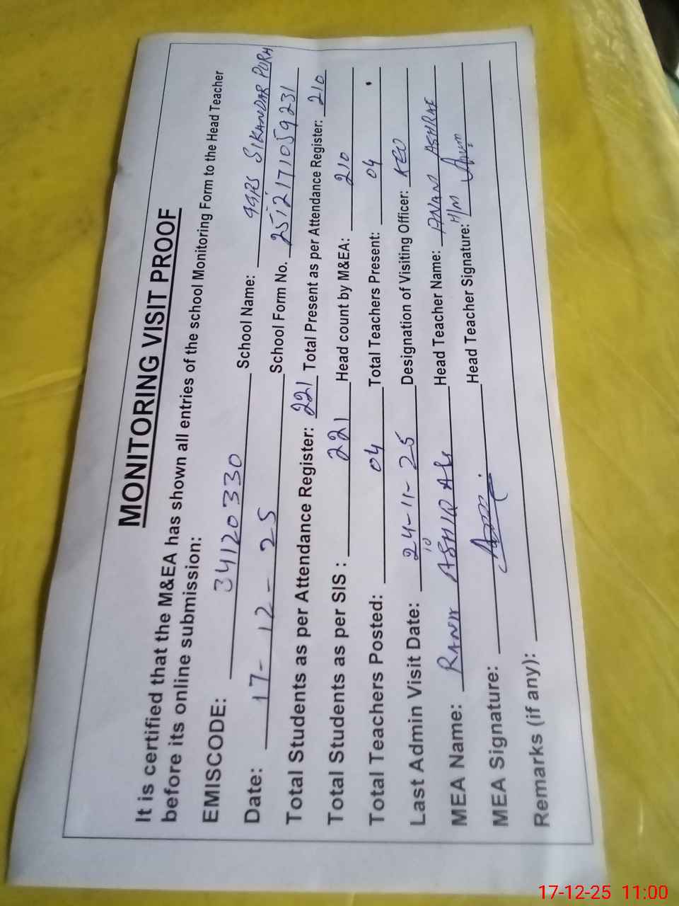 | Attendance Register | Head Teacher | MEA with School | Visit Proof |