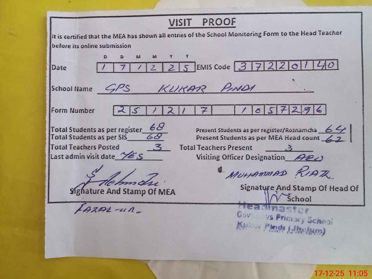 | EMIS Code: 37220140 | Name of School: GPS KUKAR PINDI | |||