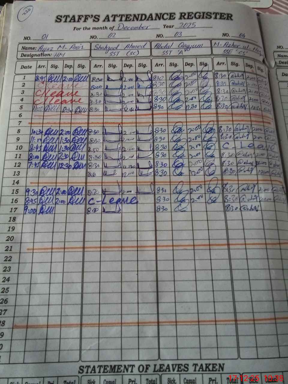 | CNIC | Full Name | Designation | R/C | Absence during last cal. month |