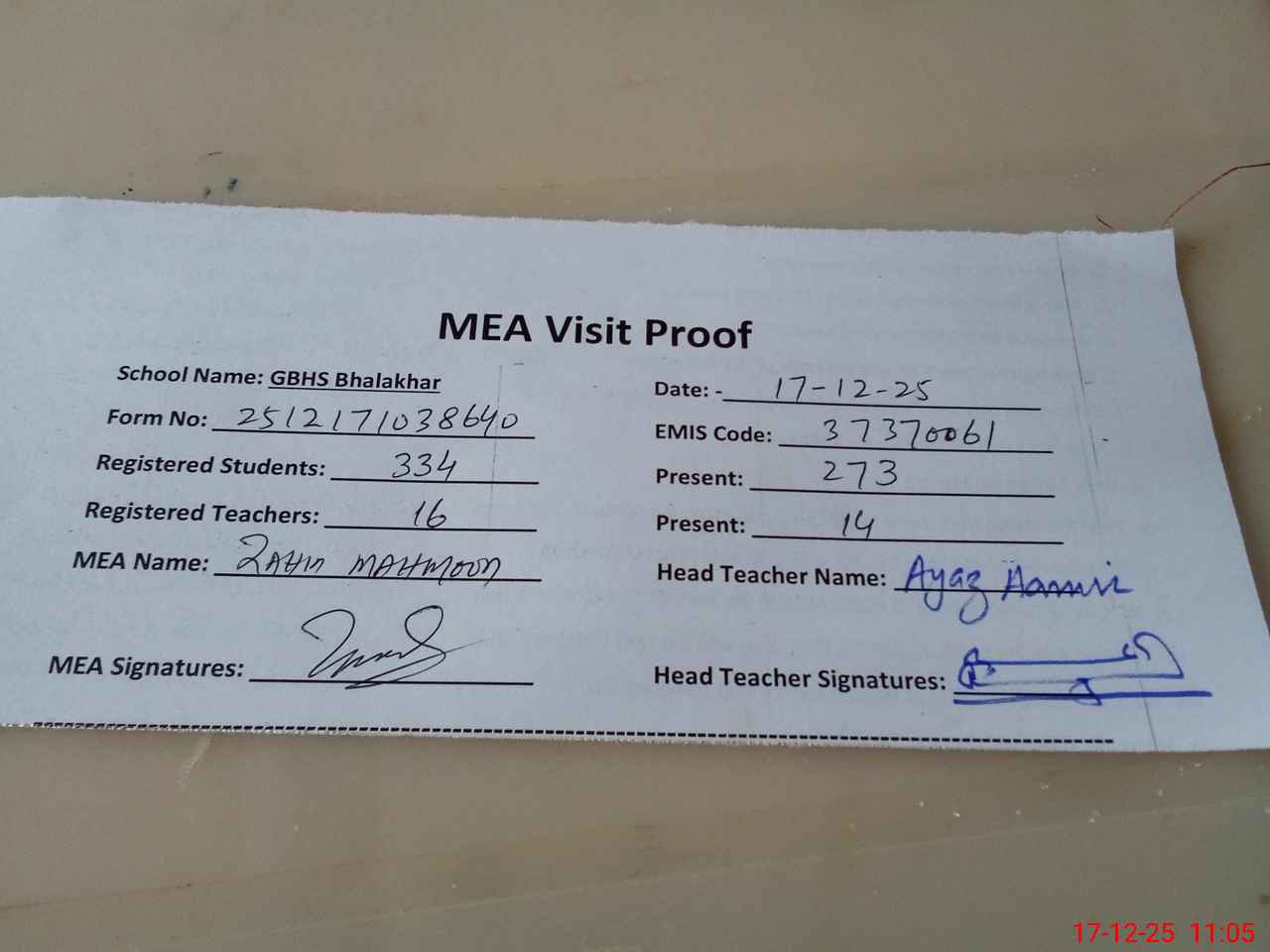 | Attendance Register | Head Teacher | MEA with School | Visit Proof |