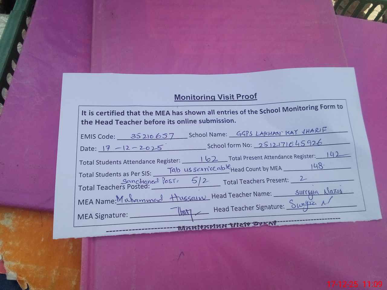 | Attendance Register | Head Teacher | MEA with School | Visit Proof |