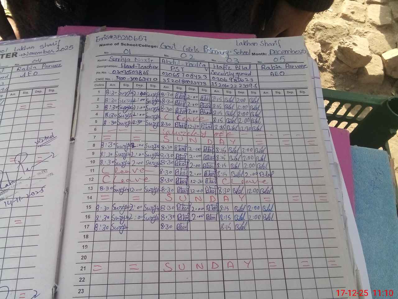 | CNIC | Full Name | Designation | R/C | Absence during last cal. month |