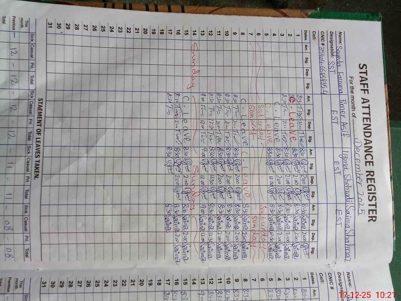 | CNIC | Full Name | Designation | R/C | Absence During Last Calender Month |